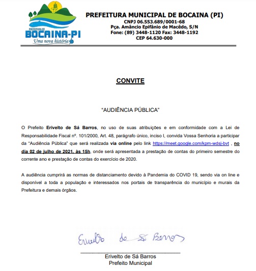 Município de Bocaina realizou audiência pública no dia 02.07.2021 para demonstrar ações do município.